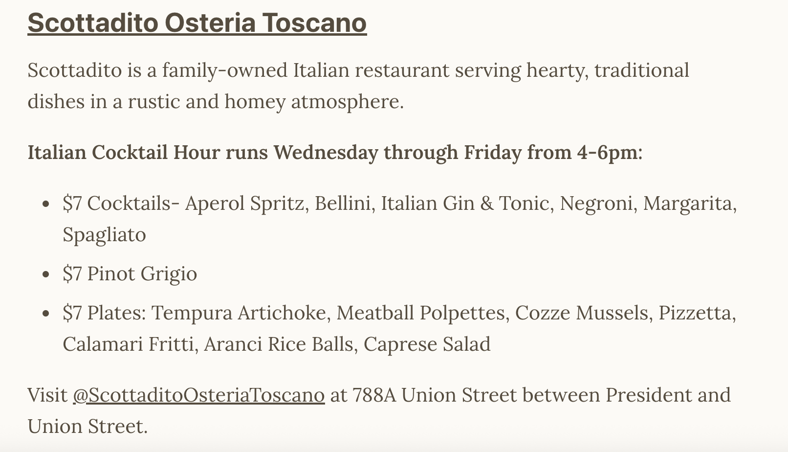 Scottadito is one of my favorite restaurants in Park Slope. I have consistently great dinner experiences, with friends, with kids, and also for romantic dining. We have enjoyed a few catered events, too. The kitchen and service staff are always excellent. Portions are generous, food is delicious, and we always feel that our patronage is appreciated.